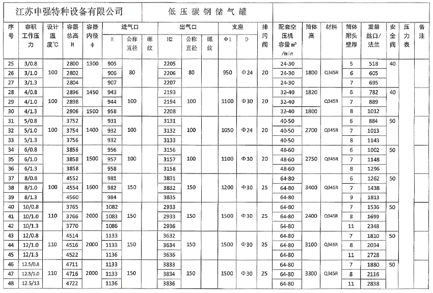 产品介绍:储气罐(压力容器),又名压缩空气储气罐。是专门用于存储压缩空气的压力容器,主要用于存气缓冲,同时起稳定系统压力的作用,避免空压机频繁加卸载和除掉大部分的液态水。